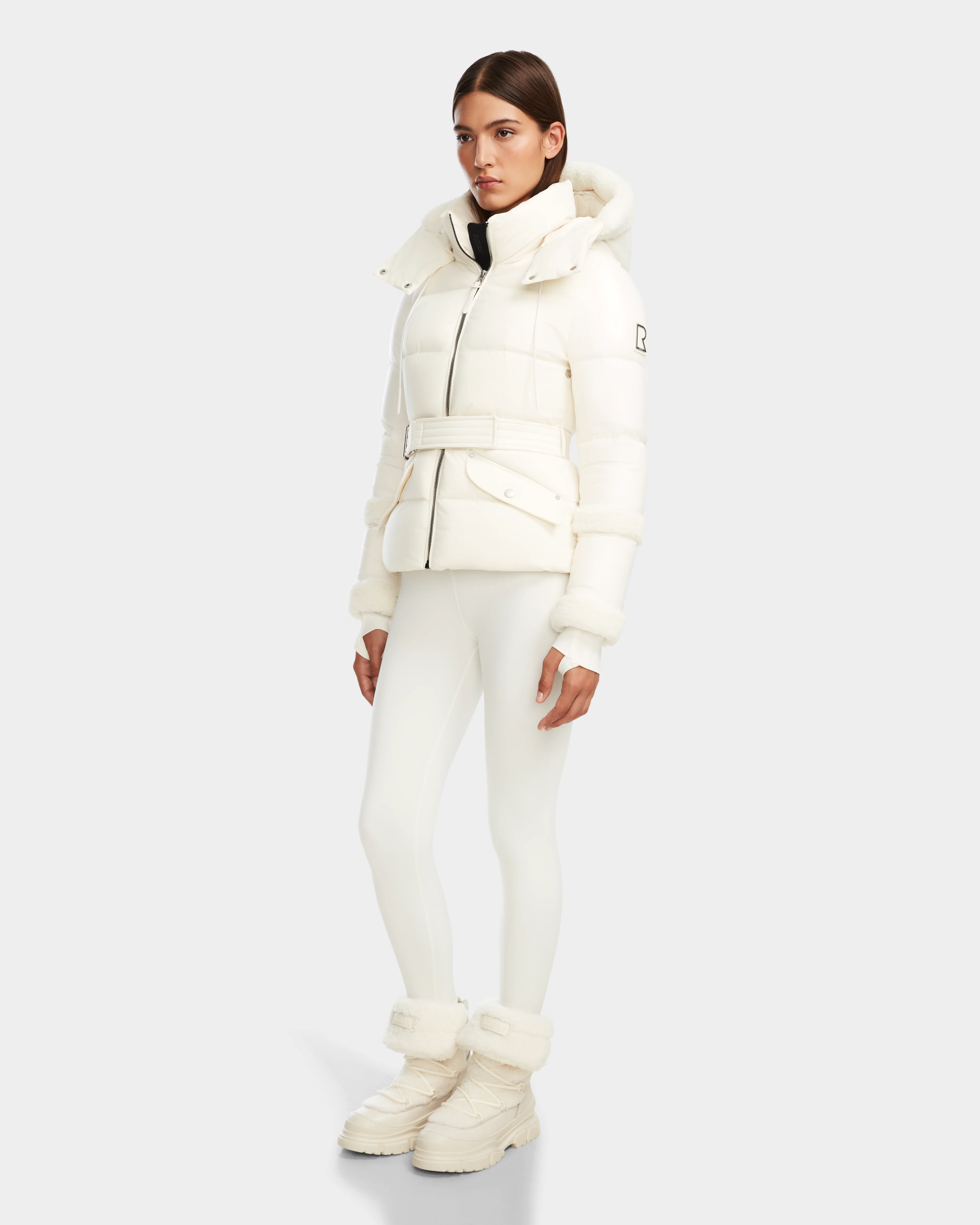 The AUDREY down puffer jacket marries style, warmth, and functionality seamlessly. Engineered for both technical performance and visual allure, it combines recycled Stormshell fabric with a lustrous recycled gloss finish, accented by faux shearling trim. These sustainable materials offer wind resistance, water repellency, and exceptional warmth, thanks to the high-loft RDS certified down fill. Featuring branded removable interior backpack straps, breathable mesh eyelets under the arms, storm-cuffs in neoprene, a removable quilted belt with adjustable branded Velcro, and a detachable storm hood, the AUDREY jacket delivers on both function and style. Stay chic and cozy with AUDREY.