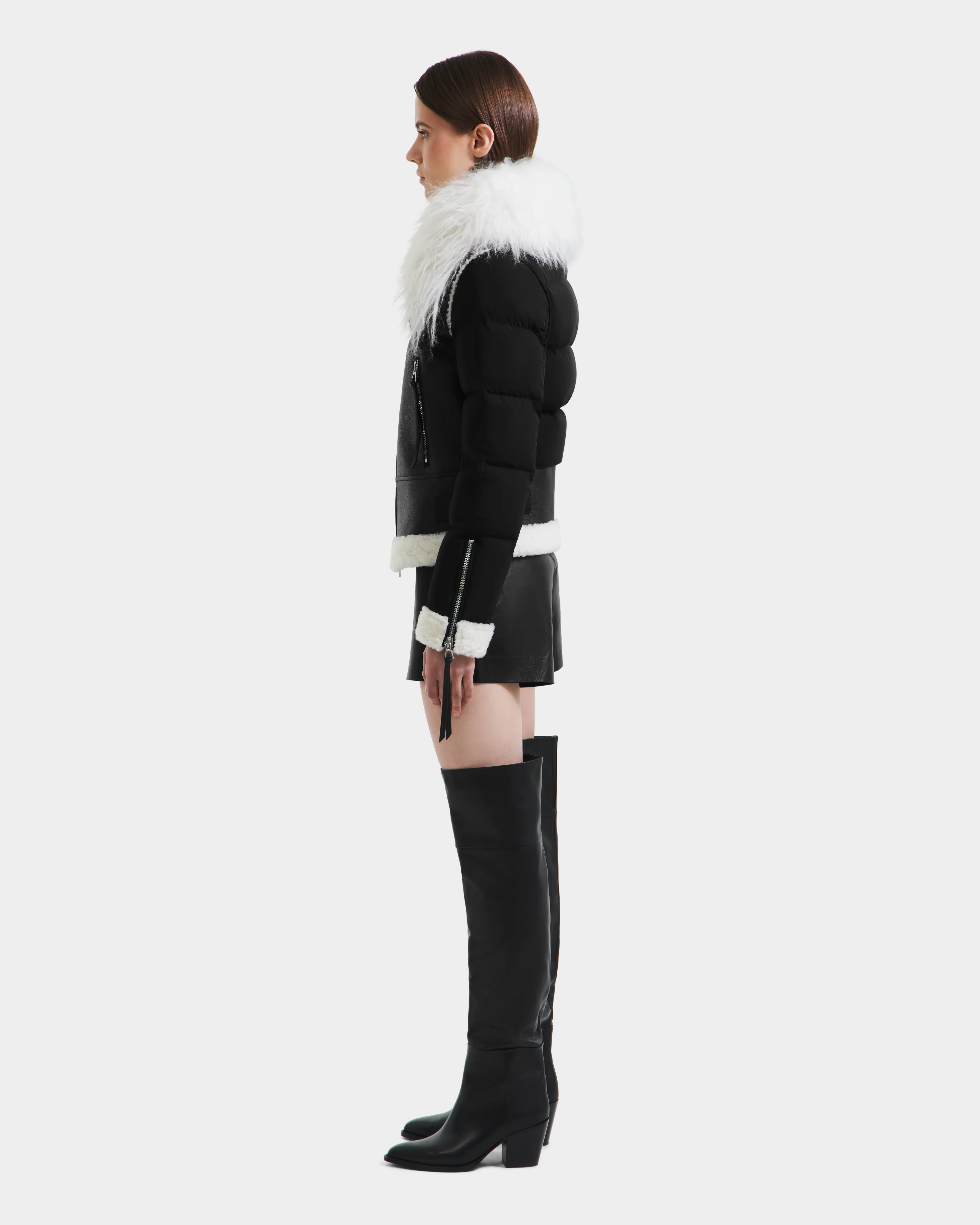 The MONKA by RUDSAK is a women’s shearling combo jacket that combines bold texture with elevated design. Crafted from plush shearling lamb with sleek nylon sleeves and back, it offers lightweight warmth thanks to responsibly sourced down and feather fill. The oversized Mongolian shearling collar adds striking contrast and luxurious volume. Finished with modern hardware and tailored details, MONKA delivers a confident, fashion-forward silhouette—ideal for creating standout looks in cool weather.