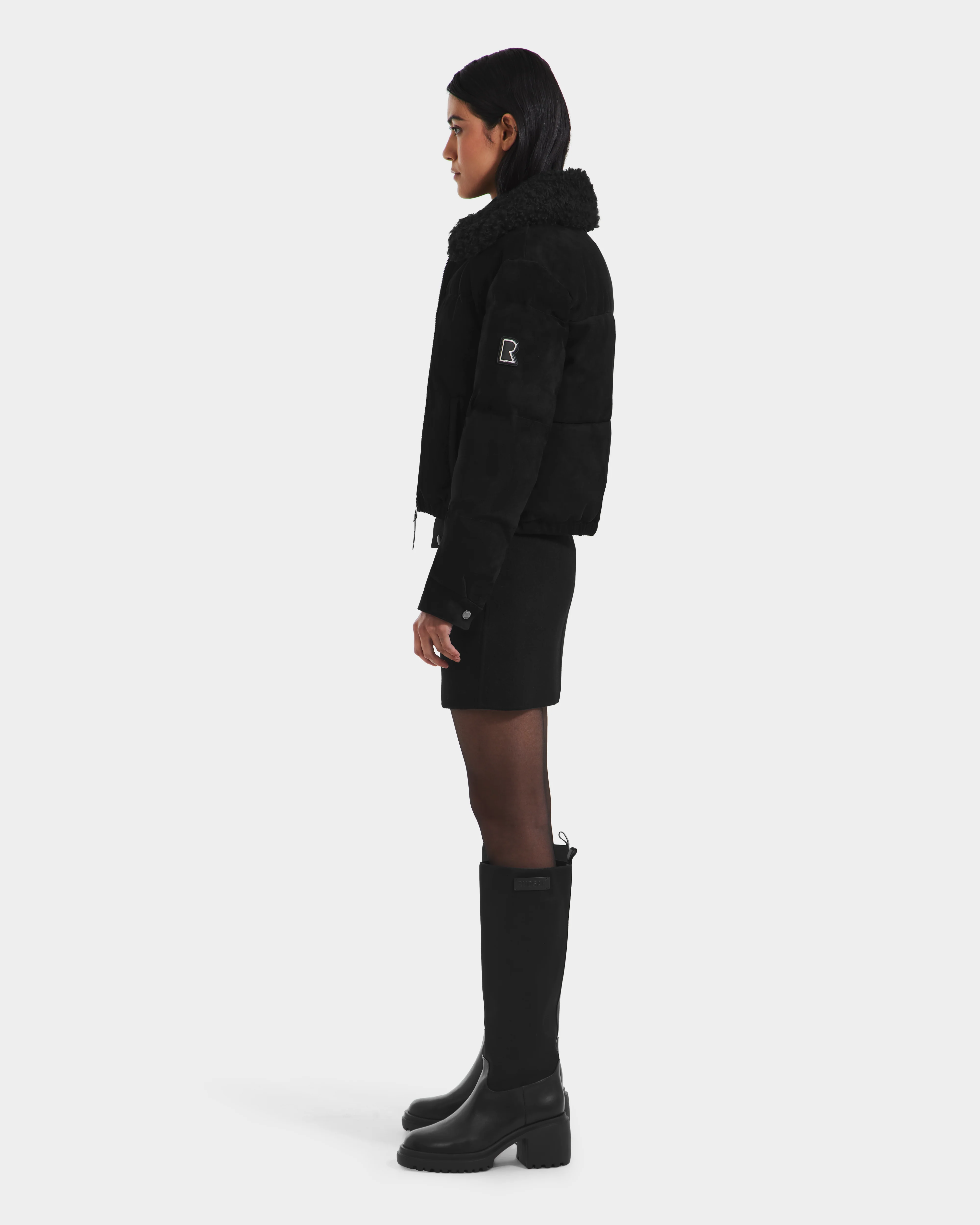 The STACEY by RUDSAK is a women’s cropped bomber-style aviator jacket that fuses rugged heritage with modern edge. Crafted from supple suede and insulated with responsibly sourced down and feather fill, it offers lightweight warmth with elevated style. Vintage-inspired with a retro attitude, this classic silhouette features a removable shearling collar for added texture and versatility. Designed to transition effortlessly from city streets to weekend escapes, STACEY delivers a refined take on an iconic, timeless staple.
